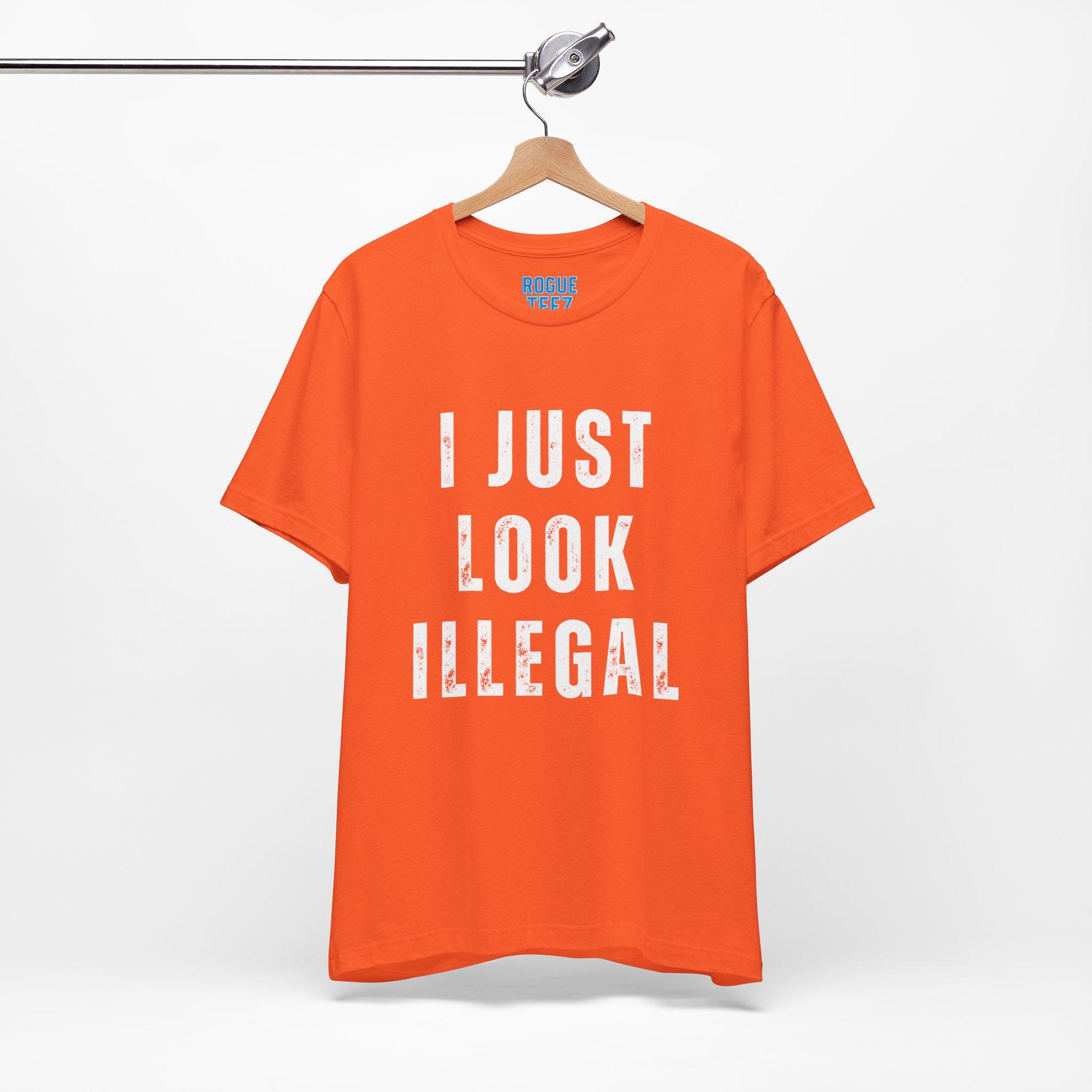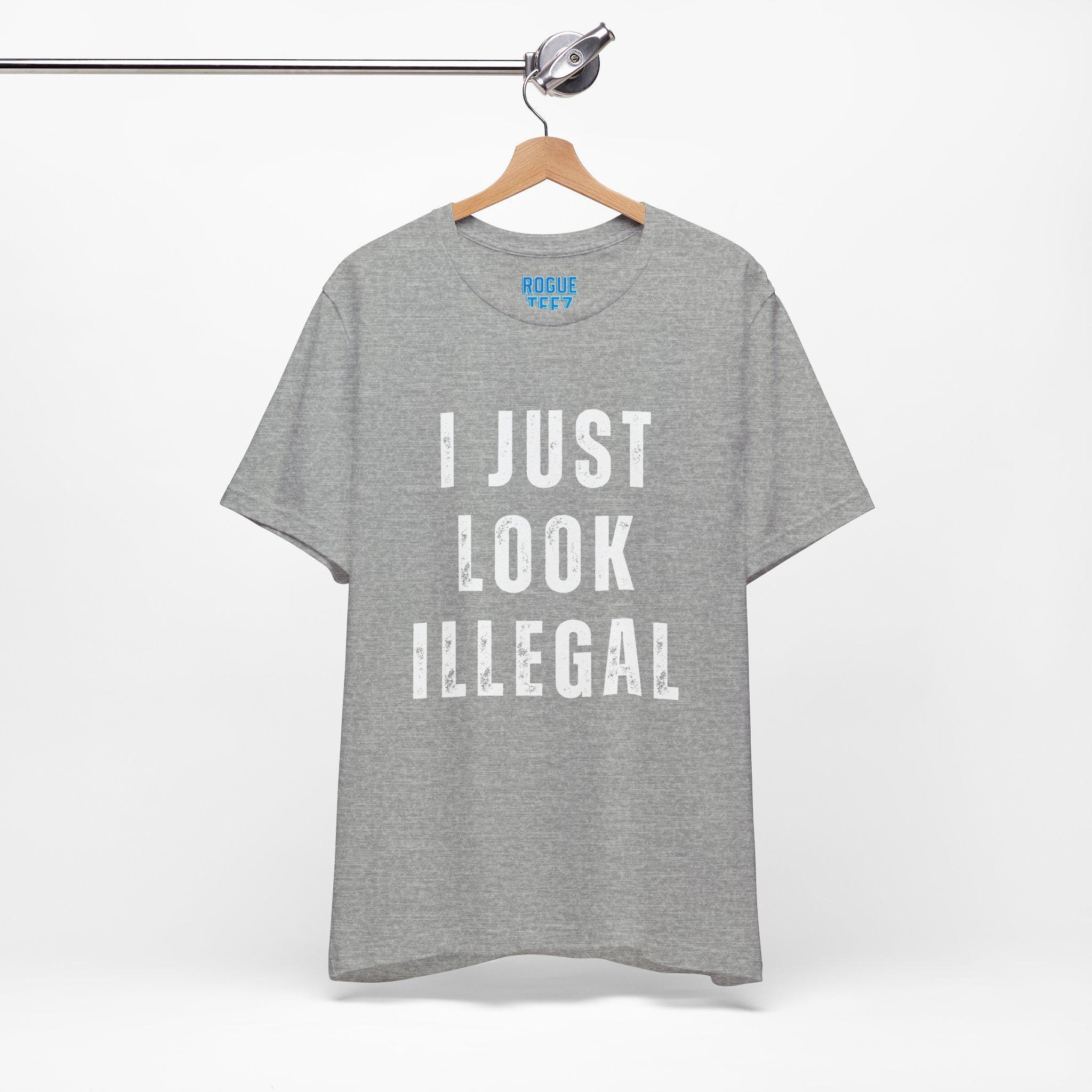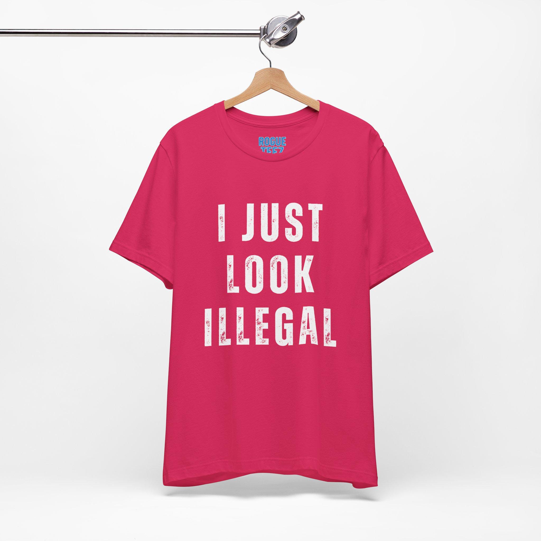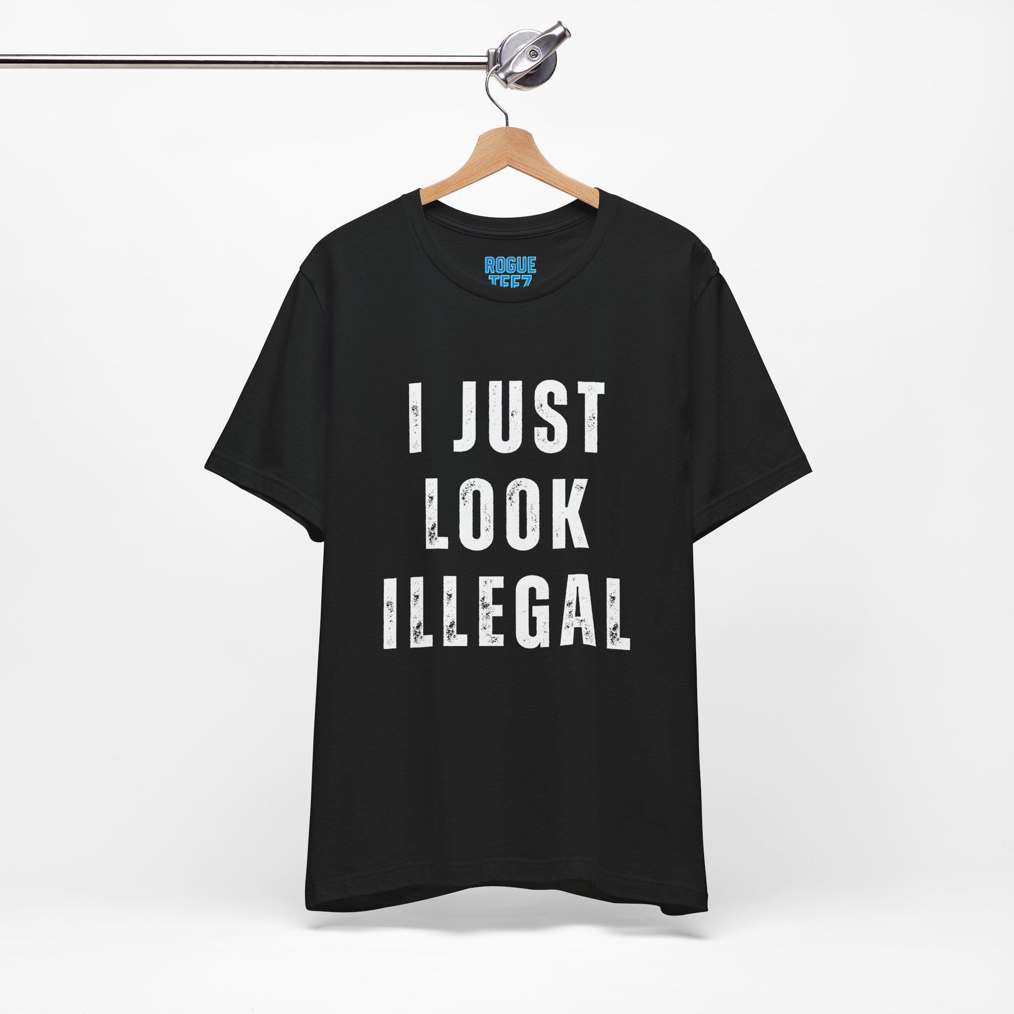 A unisex jersey short sleeve tee with the bold statement 'I Just Look Illegal' printed on the front. This tee exudes a casual and edgy vibe, perfect for everyday wear or making a statement at social gatherings. It is relevant to those who want to express their personality and beliefs through their clothing. Ideal for casual outings, protests, rallies, or social justice events.
