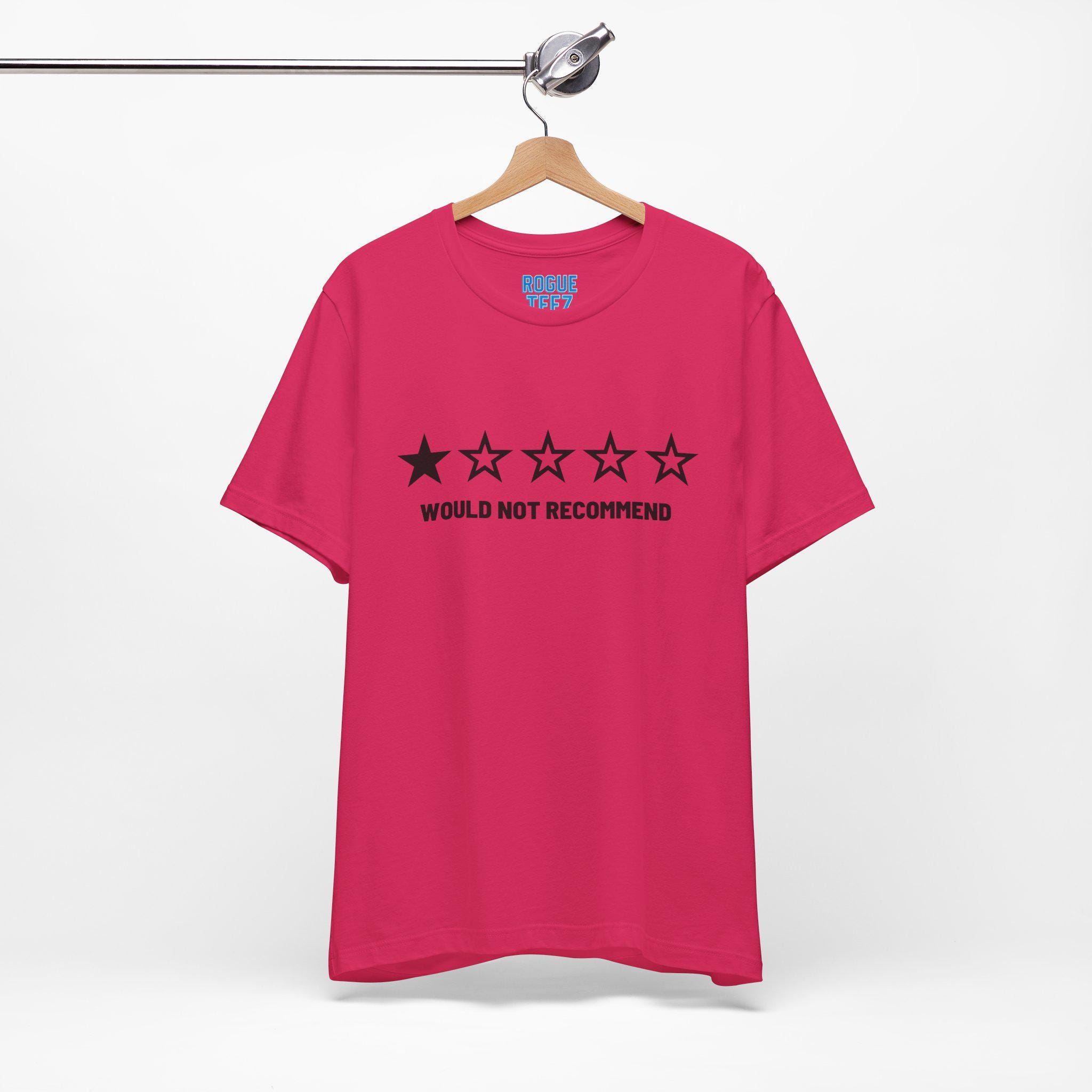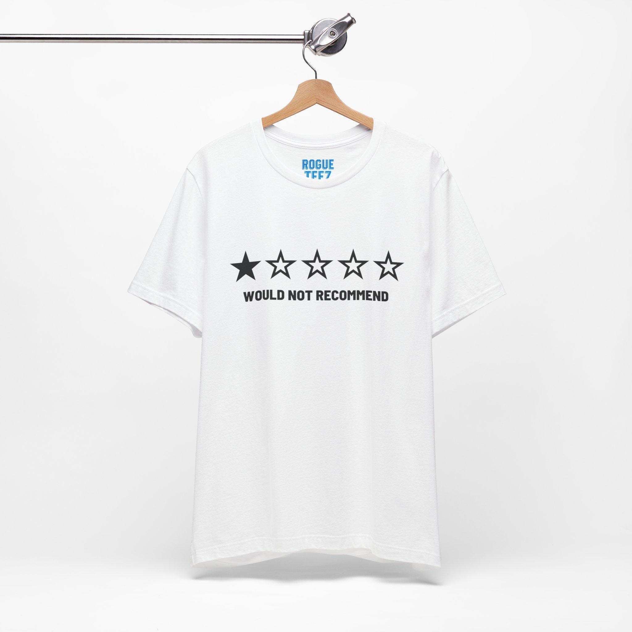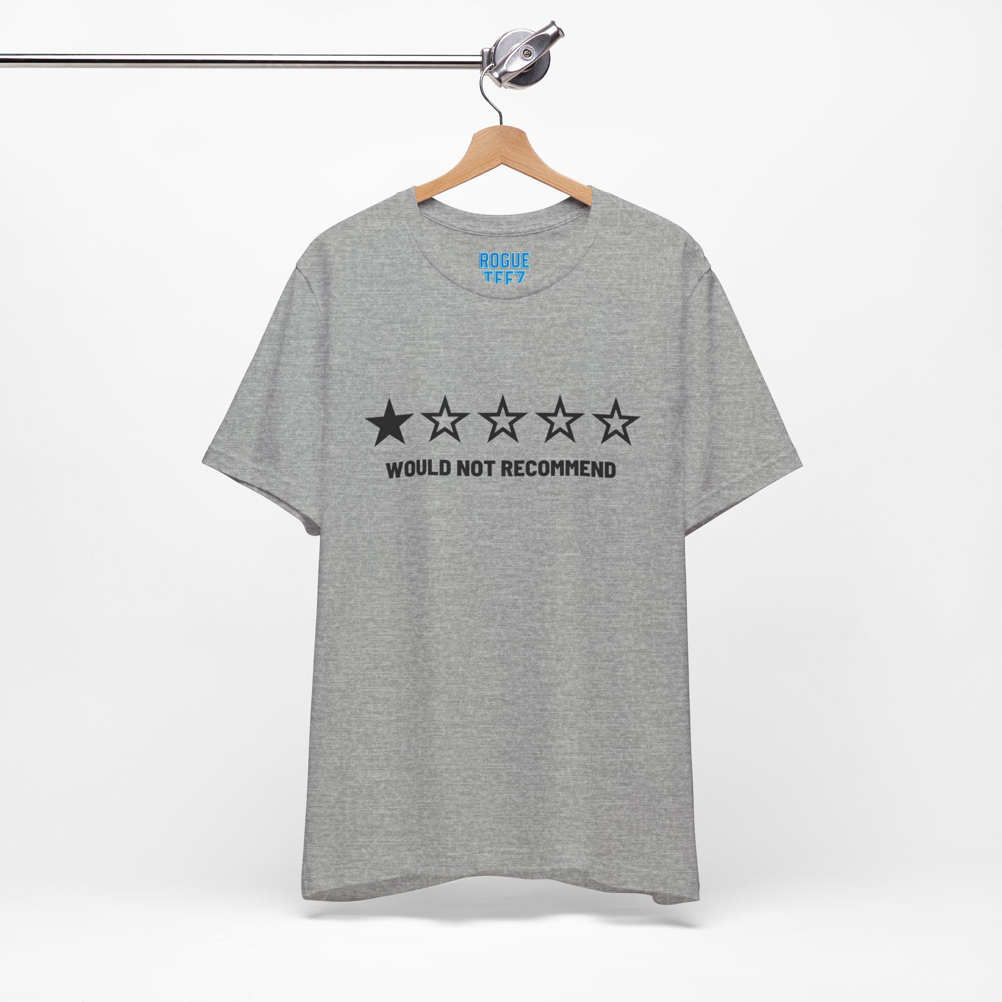 A fun and sarcastic t-shirt that reads 'Would Not Recommend'. This tee is perfect for those who appreciate a witty sense of humor and enjoy making a statement with their clothing. Ideal for casual wear and lounging around the house, this shirt is a great conversation starter and can be worn on various occasions.