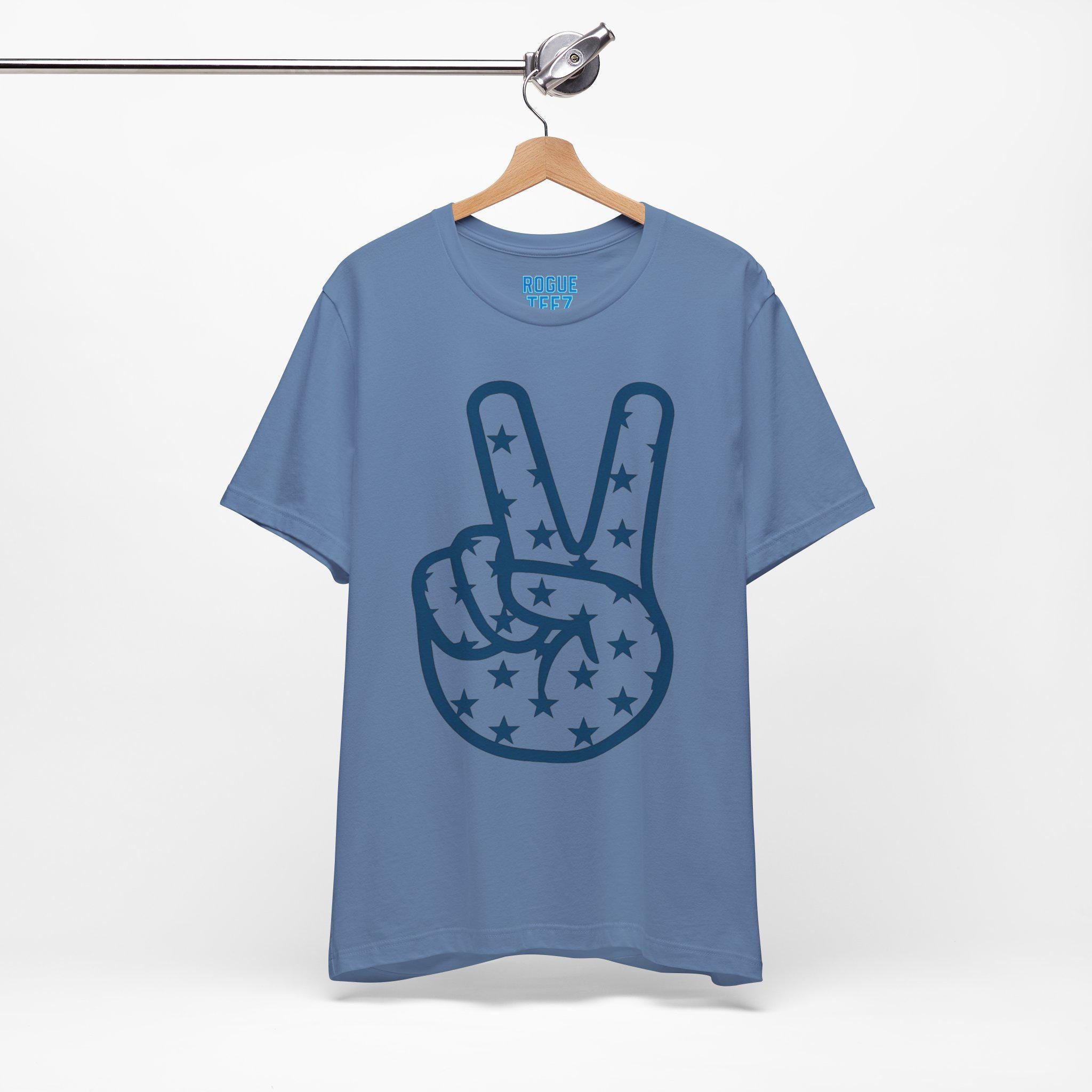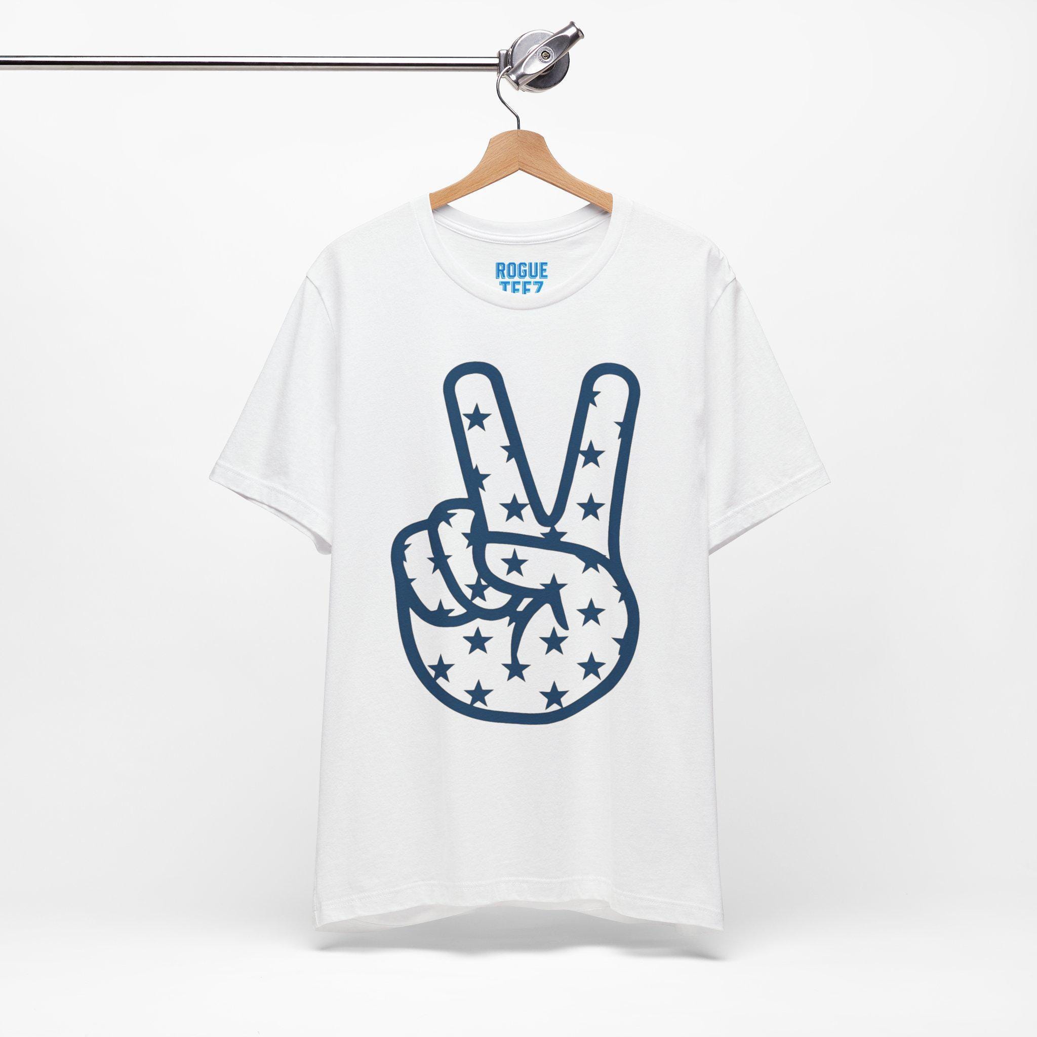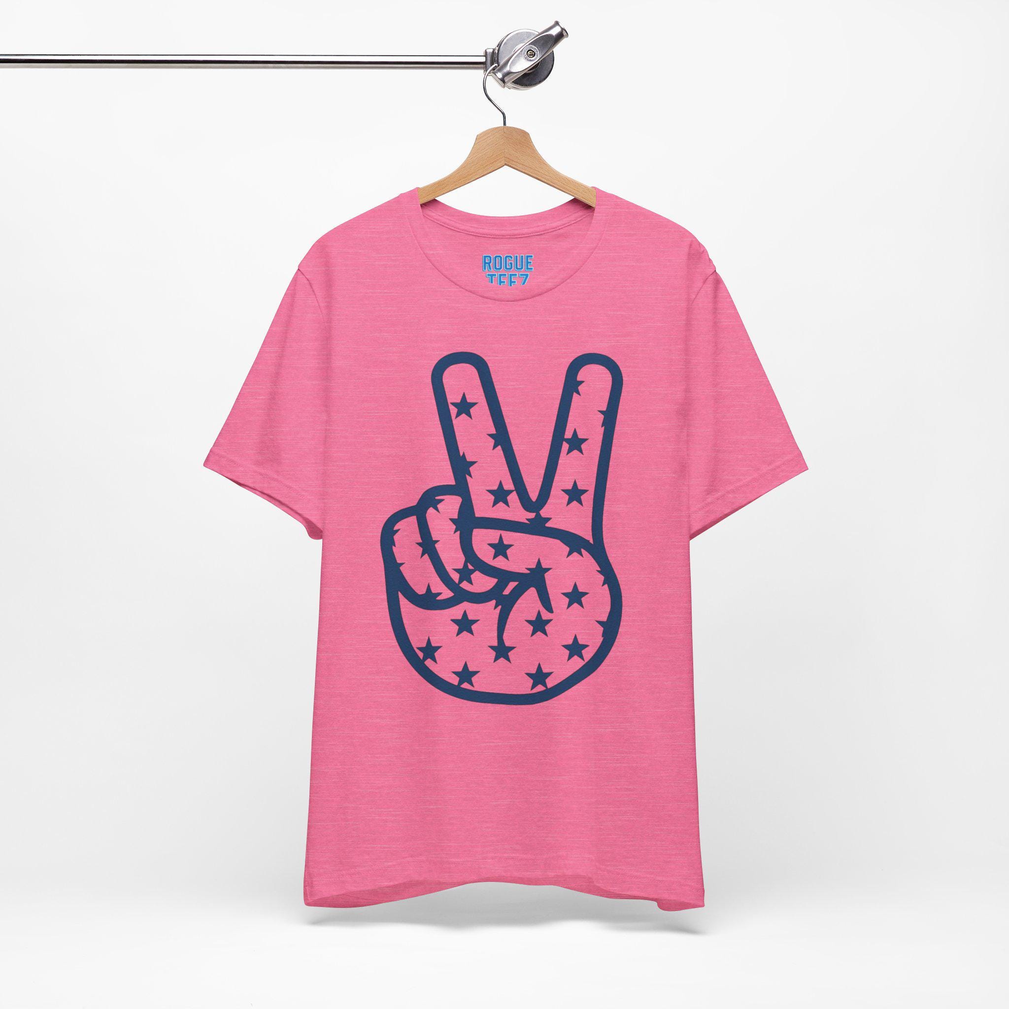 A unisex jersey short sleeve tee featuring a hand peace sign with stars design. This tee exudes a cool and laid-back vibe, perfect for casual wear. Ideal for those who love expressive and unique graphic tees. Relevant for holidays like Earth Day, Peace Day, and music festivals.