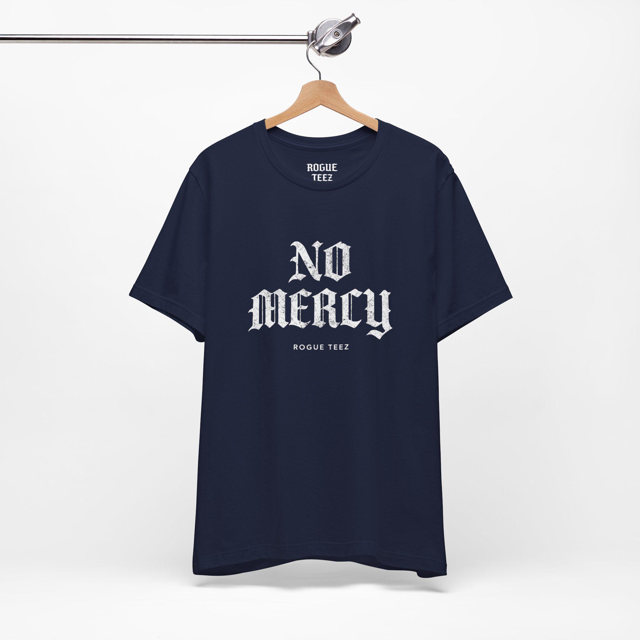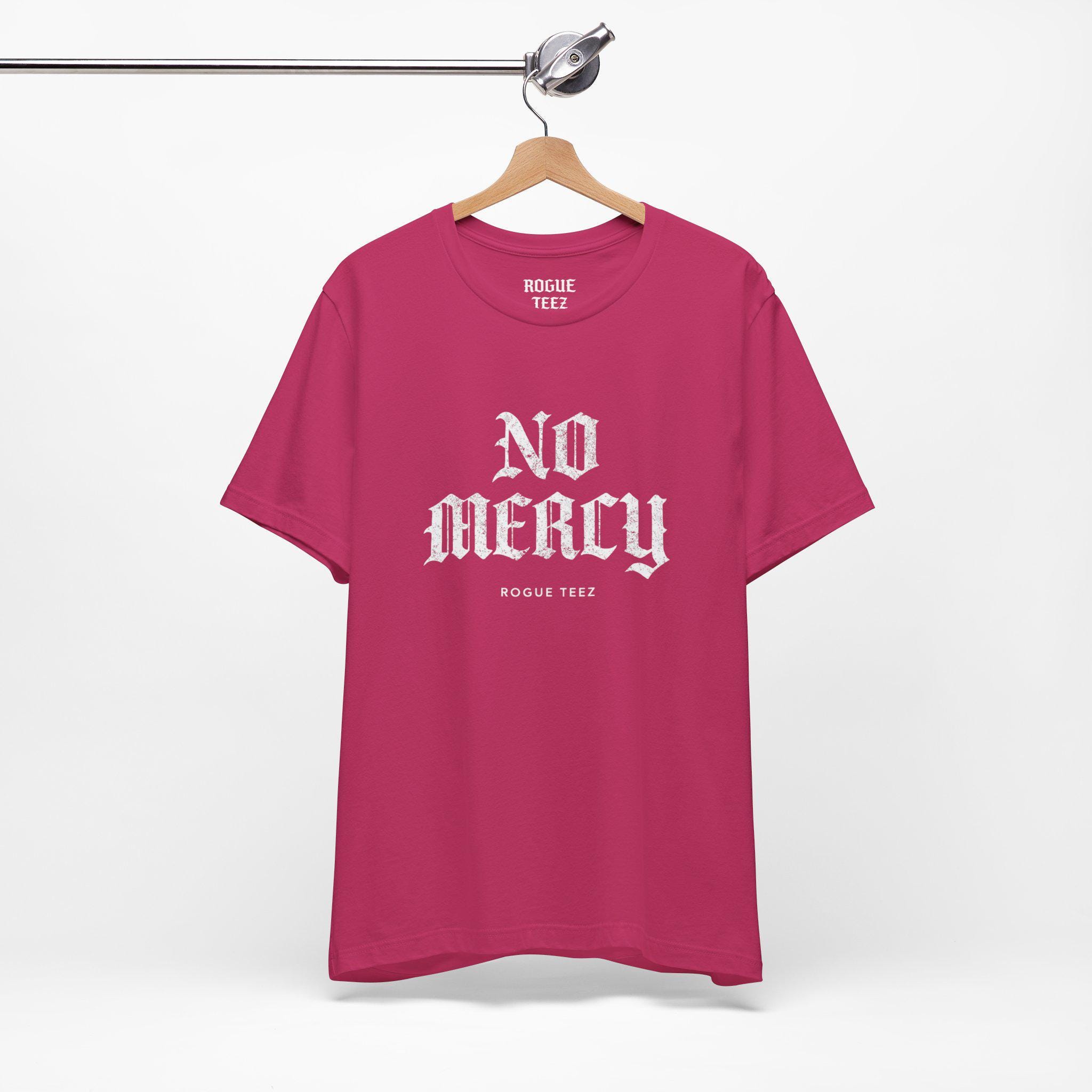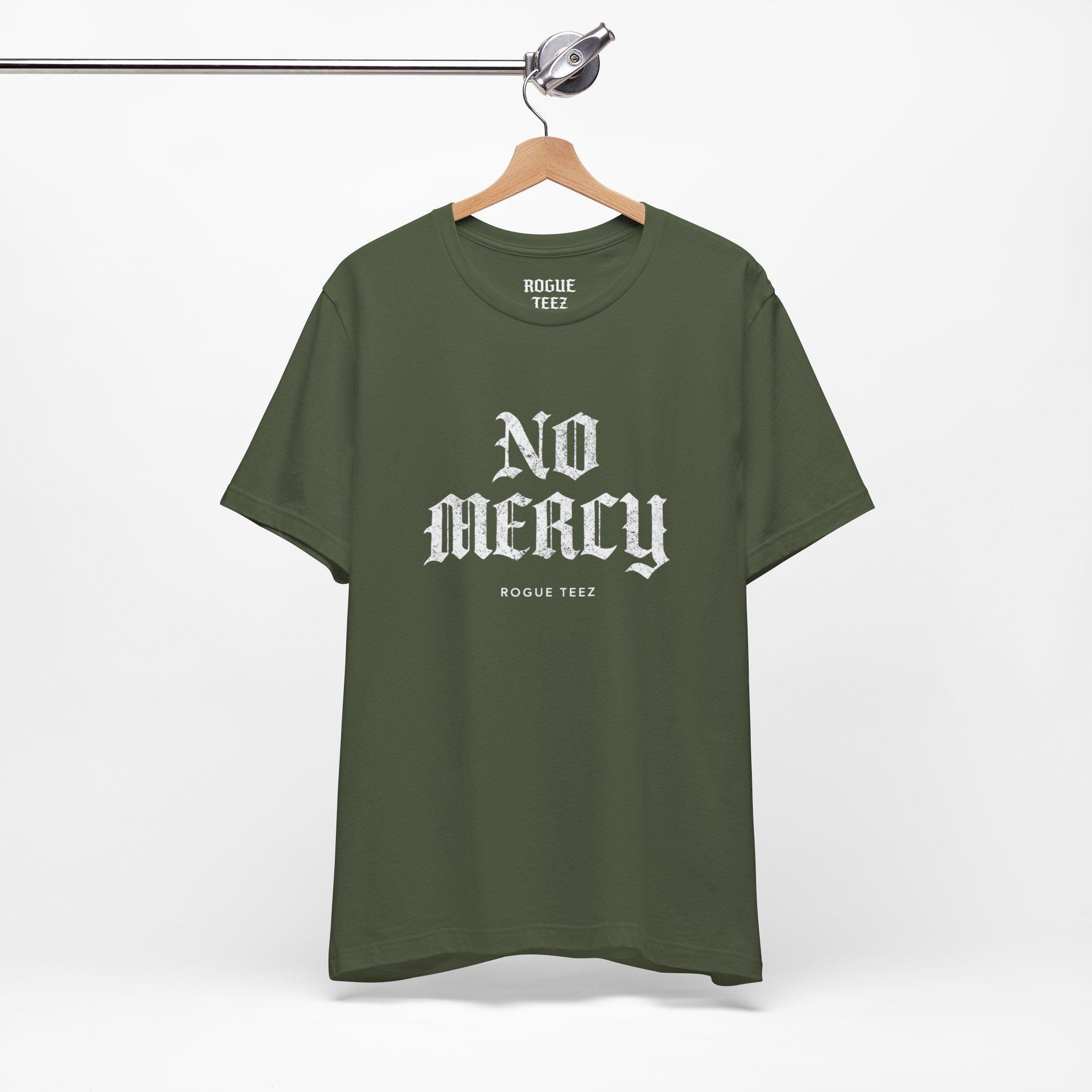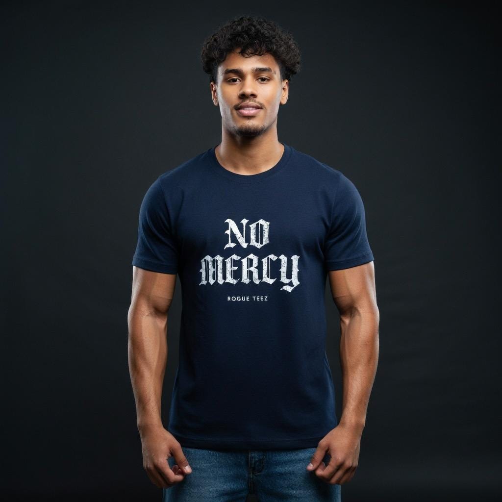 No Mercy — bold, unapologetic, and made to be worn like a statement. This lightweight jersey tee drapes cleanly over the shoulders and feels effortless against the skin. Imagine slipping it on before a long day of training, a late-night gig, or a gritty city walk: the shirt carries a raw energy that matches determination and focus. The crisp, high-contrast print reads like a challenge, not a slogan. It sits neatly under a jacket or stands alone with rolled sleeves, pairing well with worn denim or layered athletic gear. For adults who move hard and don’t soften their edges, this tee brings a simple, direct attitude to the everyday — strong lines, stable fit, and breathable comfort that keeps up with whatever you push yourself to do.