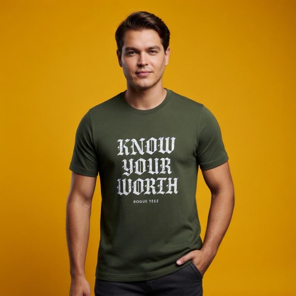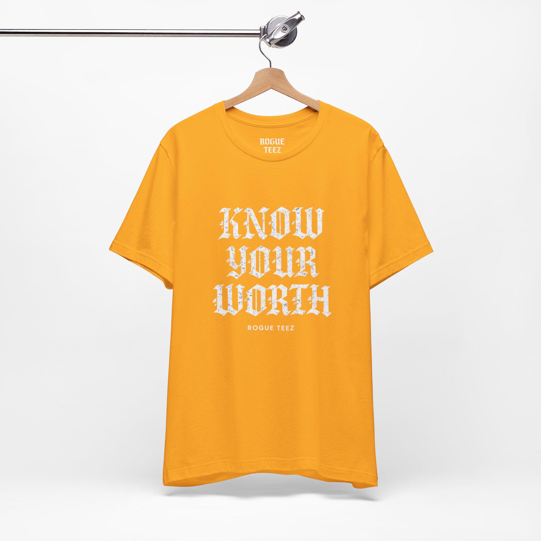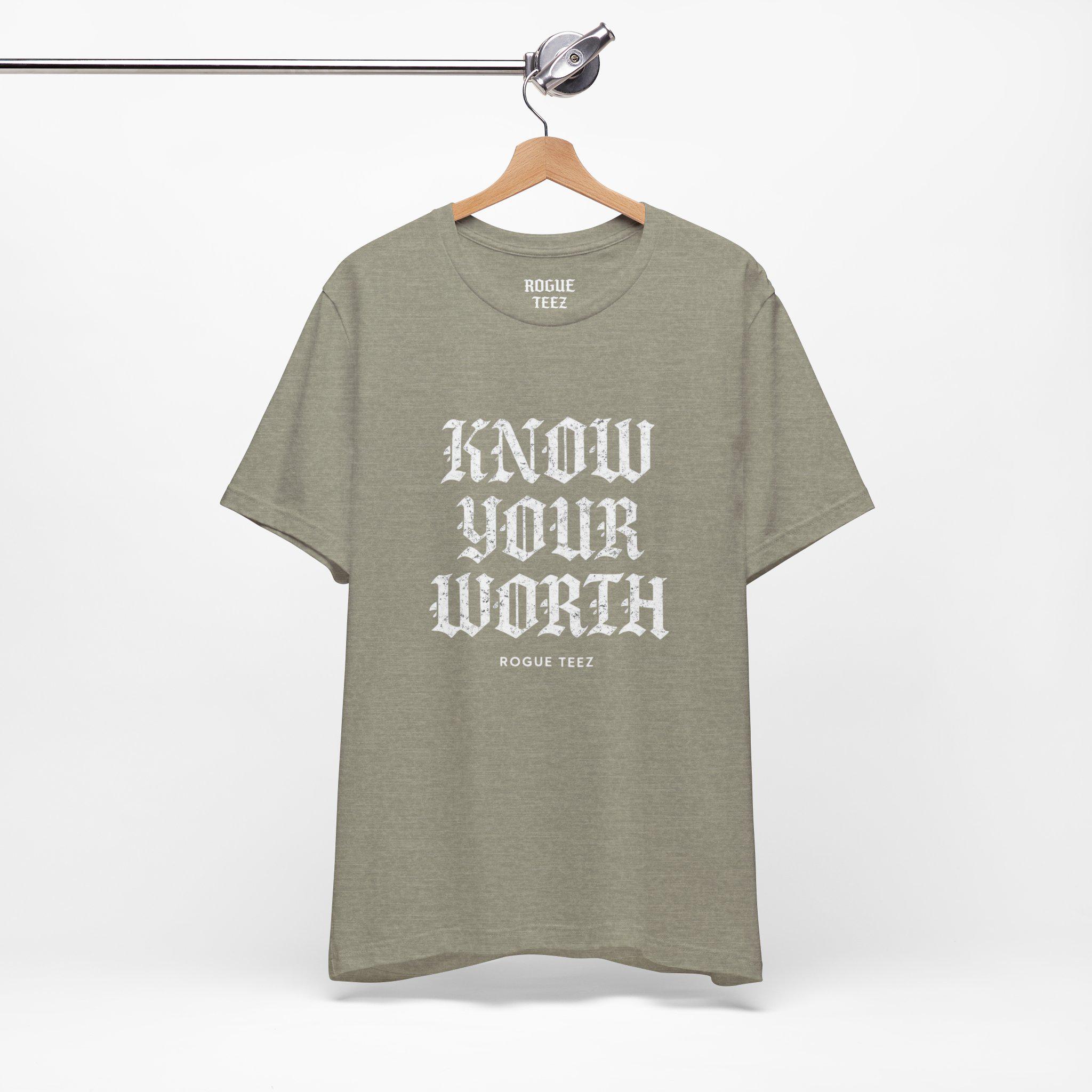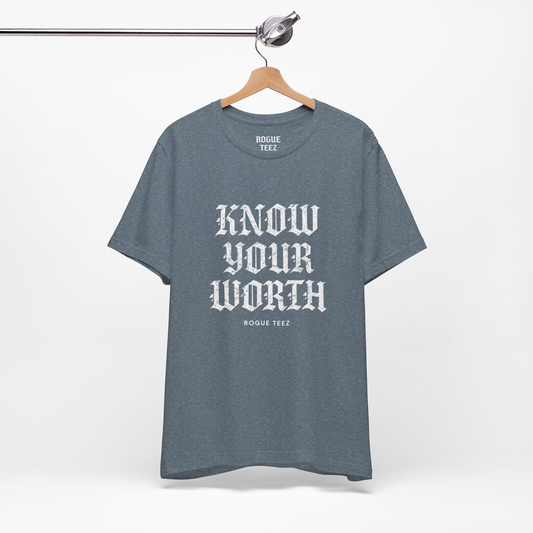 Wear this tee as a quiet declaration: Know Your Worth. The soft, breathable Bella+Canvas fabric sits light against your skin, letting the message speak without shouting. It fits cleanly at the shoulders and through the body thanks to side seams and a retail cut that layers easily under a jacket or stands alone with jeans. A ribbed knit collar and shoulder tape keep the silhouette reliable after many wears. The print keeps its clarity—crisp lines on the chest and sleeves—so the words remain sharp wash after wash. Leave the scratchy tags behind; the tear-away label keeps things comfortable. This is a simple, honest shirt that leans into confidence and steady comfort.