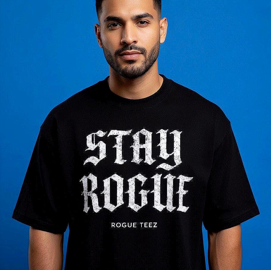 Designed by RogueTeezApparel, this tee features bold Old English “Stay Rogue” typography across the front, creating a sharp, edgy streetwear look. The clean black base paired with classic lettering delivers a strong visual impact while keeping the design minimal and wearable.